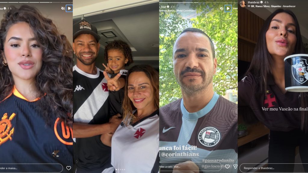 O ator Caio Blat postou um story trajado como torcedor e escreveu: “Nunca foi fácil. Vai, Corinthians”. Já a modelo Sabrina Sato compartilhou um vídeo postado pelo clube e escreveu: “Vamos, Corinthians”.