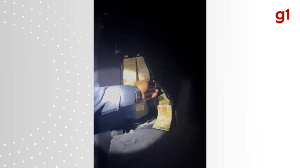 A Polícia Rodoviária Federal (PRF) registrou o momento em que bolos de dinheiro foram encontrados em compartimentos de um carro na BR-153, em Araguaína, no norte do Tocantins. Ao todo, foram apreendidos R$ 994.995. Nas imagens, é possível ver notas de R$ 100 e R$ 50 (veja no vídeo acima).